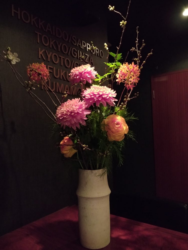 03/27/2024 In bar kikuti By kikuchi 銀座店のお花 ・吉野桜 ・キク ・エビデンドラム ・ラナンキュラス ・キイチゴ ・ユーパトリウム グリーンフェザー 蕾が硬いので開くまでに時間がかかるかもね、とお花屋さん。 今日一輪だけがきれいに咲きました。 東京も気温が下がり、全国的に開花が遅れているようですね。 もしかしたら4月8日京都店20周年パーティーの出張で桜が見られるかも、とすごく期待しています!